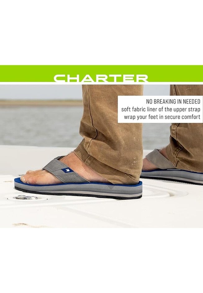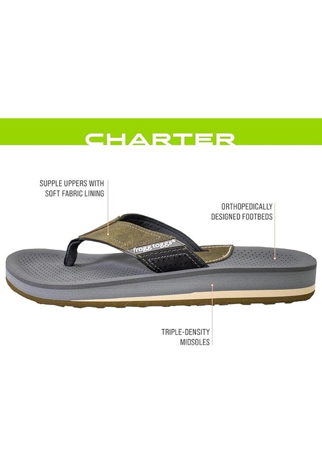 There's no need to break in our Men's Charter flip flop-style sandals, as they're built for comfort from day one. The Charter Sandal is engineered with some impressive performance features: Orthopedically designed foot beds for natural comfort, triple-density midsoles that give your feet a spa-like treatment, and soft fabric lining the uppers to keep your feet wrapped in 360 degrees of total comfort. You'll be hard pressed to find a better men's flip-flop sandal than the Charter.